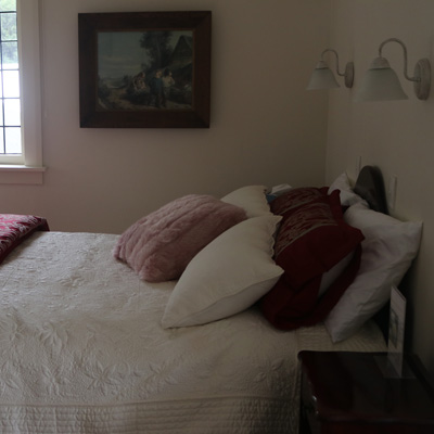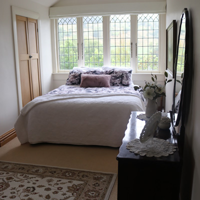 White Romance is the rose name for this room which comes with a super king bed, couch, unique dressing table, TV, separate dressing room with full length mirror and ensuite. Ensuite includes twin sinks and twin showers and a claw foot bath. These are very spacious upstairs rooms that are private with a good outlook over the gardens.